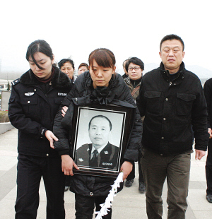 10分鐘后,當他正在檢查一輛過境貨車時,在其后面一輛等待檢查的貨車駕駛員,大聲喊“你的同事被車撞了!眳歉H⒖坛肺鱾扰苓^去,一眼就看到陳勛倒在路邊。他走近后發(fā)現(xiàn)陳勛的鼻子里、嘴里正汩汩地往外冒著鮮血。他立刻拿起手機撥打了120,又及時地將情況匯報給大隊領導。“我跪在他身邊,不停地呼喊著他的名字,可是他卻始終不理我!闭f著,吳福泉的眼睛濕潤了。