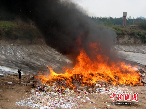 中新網(wǎng)綿陽3月30日電 (楊超)30日,伴隨著烈火濃煙,38600條假煙灰飛煙滅。這是2008年4月以來,四川綿陽市煙草專賣部門舉行的首次集中銷毀假煙行動(dòng)。