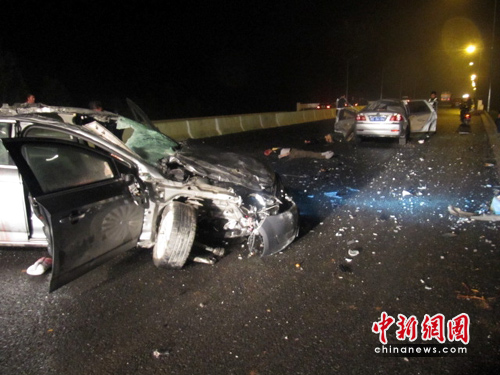 據(jù)勘察現(xiàn)場的交警分析,當時掛滬J86981號的福特轎車從鐵山港方向向市區(qū)行駛,當行駛至二號橋附近時,沒有看到道路中間的隔離帶,一下沖上了隔離帶的緩坡。由于車速過快,轎車飛速砸向相向而來的一輛桂E36186的力帆轎車,造成車內(nèi)的乘員被拋出車外。完