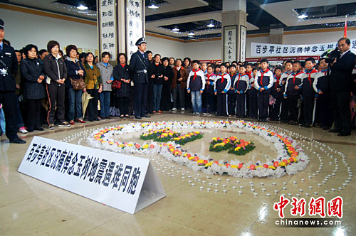 上午10時,數(shù)百名武漢百步亭居民、育才小學學生代表有序來到社區(qū)活動中心。在工作人員的引導下,他們靜靜地圍繞著用鮮花扎成的“4.14之心”分排站好,手捧蠟燭,向遇難同胞默哀。活動現(xiàn)場,居民自發(fā)手折紙鶴,以此寄托對災區(qū)民眾的牽掛與祝愿。