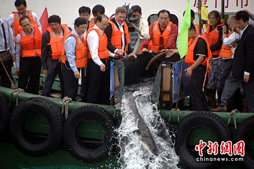 中新社廈門(mén)4月22日電 (記者 陳悅)22日下午,廈門(mén)在九龍江雞嶼海域放流108尾有“魚(yú)類(lèi)活化石”之稱(chēng)的中華鱘。其中四只在海洋公園保育基金贊助下,首度配上“衛(wèi)星追蹤信標(biāo)”,相關(guān)專(zhuān)家表示,這將是中華鱘研究及保育的一大突破,將開(kāi)展有效保育中華鱘新的一頁(yè)。