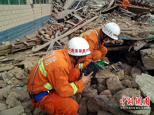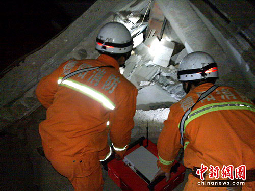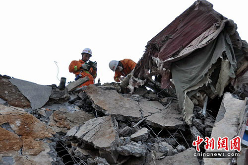 “有人、有人,快挖!”他們立即放下探測裝備展開營救,周圍的消防官兵也聞迅投入到營救中,他們先用鐵鏟將被埋人員上方的磚塊、混凝土等鏟除,利用液壓擴張器、金屬切割器等專業(yè)救援裝備,將斷裂的樓板等進行分開、支撐、掀起,努力開辟營救通道。為避免鐵器傷及被埋人員,救援人員徒手將石塊、鋼筋和建筑殘渣進行清理,一層一層向下挖,很快一支手臂出現(xiàn)在官兵們眼前,他們加快速度,不到5分鐘,這名婦女被救出了廢墟,遺憾的是,這名婦女由于傷勢過重早已勛命。肖國平楞住了,他滿懷心切,以為能救出生命,他的心沉甸甸的。按照當?shù)亓曀,死者應該由僧人來挖,且要現(xiàn)場念經(jīng)超度。他們收拾起沉重的心情立即投入到搜索被困人員中。