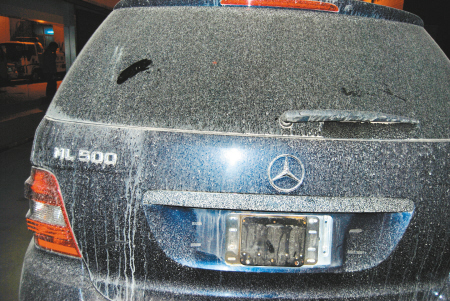 當(dāng)晚7時(shí)許,記者聞?dòng)嵹s到青年路交警蓮湖大隊(duì)時(shí),一輛車身沾滿泥巴的黑色奔馳ML500越野車已被警車拖到交警隊(duì)的院子里,只見車前的引擎蓋和車身上分別寫有“倉(cāng)庫(kù)門口請(qǐng)勿停車”和“傻、犯罪”等字跡,F(xiàn)場(chǎng)一位不愿透露姓名的交警告訴記者,這輛奔馳越野車正是被警方監(jiān)控到涉嫌碾軋女警張昂胳膊后逃逸的可疑車輛,并透露可疑車輛當(dāng)時(shí)停放在西五路一廢品站外,后經(jīng)過大量調(diào)查取證,可疑奔馳越野車被交警蓮湖大隊(duì)拆卸掉前后車牌,隨后拖回交警隊(duì)。
