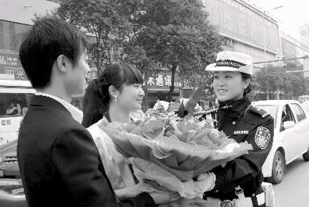 昨日早上9時許,新郎宋貴權(quán)和新娘陳芳就抱著一束鮮花,來到綿陽交警直屬一大隊,找他們的“護(hù)嫁天使”。一位交警告訴他們,吳莎可能在嶺南崗?fù)?zhí)勤。宋貴權(quán)和陳芳又抱著鮮花趕到嶺南崗?fù)ぃ锩娌]有人,一名在路口執(zhí)勤的交警告訴他們,吳莎要10點(diǎn)鐘才來。宋貴權(quán)和陳芳就抱著鮮花在嶺南崗?fù)さ却?/p>