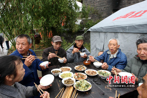 7日中午,記者在重慶墊江縣沙坪鎮(zhèn)李白村一災(zāi)民安置點(diǎn)看到,8名受災(zāi)群眾正吃著熱氣騰騰的飯菜。“自家房屋在5日晚被風(fēng)暴雨吹跨后,今天是在災(zāi)后第一次吃上了熱飯菜!币秽嵭沾迕窀嬖V記者,除能吃上熱騰騰的飯菜外,他們的安置帳篷也已搭建完畢。