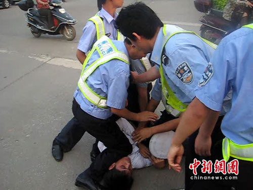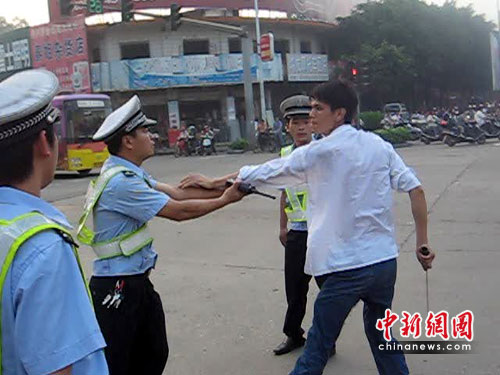 該司機在返回現(xiàn)場接受處理時直接質(zhì)問民警:“現(xiàn)在已經(jīng)是傍晚6點30分了,我的車為什么還不能過?”情緒異常激動的他跟本聽不進執(zhí)勤民警的任何解釋和勸導(dǎo)。隨后,該司機回到貨車駕駛室內(nèi)拿來一把長約一米的大砍刀,徑直來到中山崗紅綠燈路口就想沖上前欲砍民警。