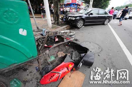 目擊者鄭小姐說(shuō),當(dāng)時(shí)她騎著電動(dòng)車,在豪華轎車后面,與其同向行駛。豪華轎車先刮碰到一名騎自行車的女子,接著,非機(jī)動(dòng)車道上一名騎摩托的男子和一名騎電動(dòng)車的男子被撞飛,高度超越小車車頂,又重重摔到了人行道上。附近商家則說(shuō),豪華車是為躲避騎自行車的女子,打方向盤向右避讓,隨即撞上兩名騎車的男子!叭绻麤](méi)這棵樹(shù)就慘了,可能更多人被撞。”高先生的小車當(dāng)時(shí)就停在事發(fā)地附近等朋友。他說(shuō),他先是聽(tīng)到一聲刺耳的剎車聲音,循聲看去,看到兩名騎車男子被撞飛。另有目擊者說(shuō),豪華車撞人后繼續(xù)往前沖,撞倒路邊的電話亭,再撞上行道樹(shù)后才停下。受傷的三人中,一人昏迷不醒,滿身是血。豪華車司機(jī)沒(méi)有受傷。