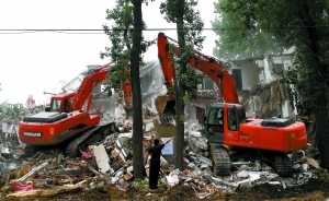 8時(shí)30分許,東北角被拉上了警戒線,城管、公安和消防部門(mén)進(jìn)行了拆遷前最后的清場(chǎng)。9時(shí)整,7臺(tái)挖掘機(jī)開(kāi)始同時(shí)向盛佳網(wǎng)絡(luò)公寓掘進(jìn),不到半小時(shí),3層小樓的外立面已面目全非。同時(shí),東北角的另外幾棟待拆公寓也開(kāi)始動(dòng)工,華倫公寓的平房被逐一推倒、金唐公寓變?yōu)榱艘欢淹叩[。