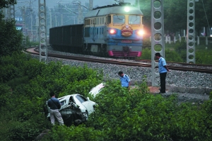 李天路道口兩側(cè)設(shè)紅燈,有管理員把守。昨日下午6時許,道口北側(cè)數(shù)十米處,一輛白色轎車趴在溝內(nèi),車輛前后都被撞變形。司機(jī)的3名親屬和1名民警正在查看車內(nèi)散落的物品。