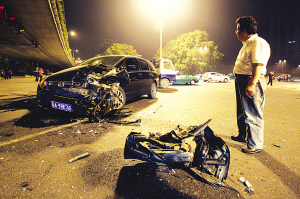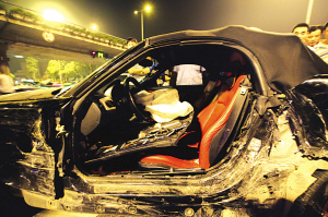 “乖乖,我跟在他后面說他要出事,這車開得像飛一樣,果不其然才一分鐘不到,真的出事了!蹦繐羰忻裢蹰L來先生說,事發(fā)時這輛寶馬跑車從新街口方向,由東向西沿漢中路如飛一樣開去。由于車速很快,加上深夜寶馬跑車發(fā)出噪音,讓馬路上同方向車輛躲閃不及,其車子后面好像還有一輛超速跑車,王長來先生懷疑兩車在超速飆車!笆袇^(qū)內貼地飛行能不出事嗎?”王長來說,他跟到漢中門長途汽車站門口,寶馬Z4敞篷跑車速度快得讓他吃驚,突然在漢中門高架下,這輛寶馬車與一輛本田商務車相撞,商務車左側車頭被撞得粉碎,寶馬車則丟失了自己的左側車門,騰空在原地打了一個180度轉,原本車頭向西被撞擊后,車頭一下子朝東了。