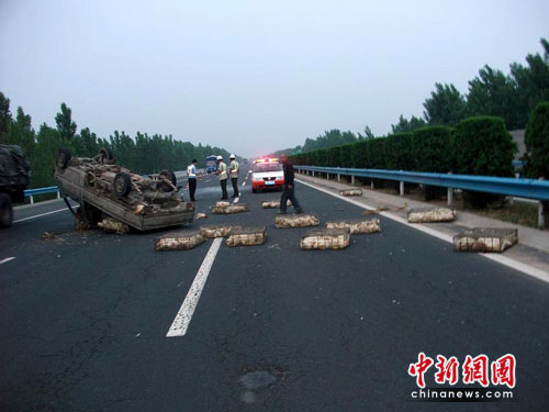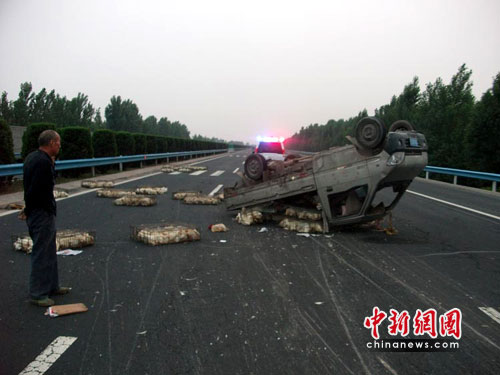 2010年6月22日中午13時許,炙熱的太陽照得大地只想冒煙,一輛白色小貨車滿載雞子疾馳在京港澳高速公路上。當(dāng)行駛到京港澳高速632公里西半幅時,突然“咚”一聲響,坐在駕駛位上的李某突然感覺車輛傾倒,控制不住疾馳的貨車,車輛側(cè)翻在高速公路上,滿車的雞子撒在路上,到處都是雞毛。河南高速交警總隊黃河二橋大隊接到過路司機(jī)的報警后,迅速趕到事故現(xiàn)場,設(shè)置警戒帶,迅速搶救傷員,所幸駕駛員李某事先行車時扎緊了安全帶,只是受了皮外傷,在急救人員救出時依然茫然不知所措。在民警、路政工作人員的共同努力下,迅速清理現(xiàn)場,恢復(fù)路面正常通行。