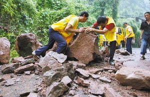 記者看到,垮塌的邊坡高約30米,寬約4米,滾落的巖石雖然被清理走了一部分,但仍可看到最大的也有1平方米。“我們看到的最大的石頭約有1噸重,大小約2平方米!背滔壬f,“滾落的石頭大約有15噸的樣子!