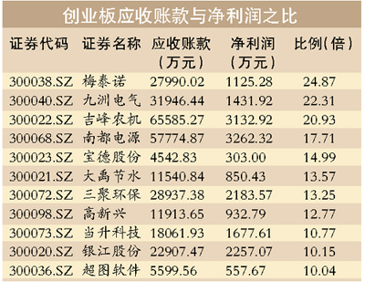同花順資訊統(tǒng)計(jì)數(shù)據(jù)顯示,創(chuàng)業(yè)板上市公司中報(bào)暴露出來的應(yīng)收賬款余額高達(dá)120.97億元,凈利潤(rùn)則為32.63億元,應(yīng)收賬款是凈利潤(rùn)的3.71倍。