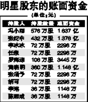 據(jù)了解,華誼最早的原始股價是0.53元,李冰冰、任泉等一批最早的股東就是以該價格買進的?偟膩碚f,明星股東持股價最低平均每股不到1元,黃曉明等加入較晚,平均每股購入價為3元已經(jīng)算是最高。而各類明星的購買數(shù)量則是以“萬”為單位計算,如李冰冰、任泉起初就購進36萬股,而馮小剛則用151.48萬元購得288萬股。而在今年年初,華誼兄弟還公布了一套分紅方案:每10股轉(zhuǎn)增10股并派現(xiàn)3元(含稅)。于是公司明星股東手中持有的股票全部翻倍,“一哥”黃曉明持股數(shù)由180萬股變成360萬股,他在紅利方面還有54萬元進賬。“一姐”李冰冰持股數(shù)則由36萬股增加至72萬股,現(xiàn)金紅利10.8萬元。馮小剛的持股數(shù)更是翻到了576萬股,另外還拿到86.4萬元的現(xiàn)金紅利。