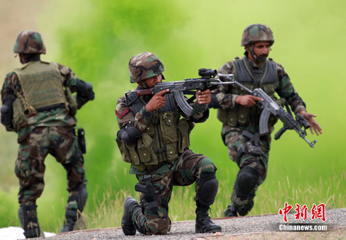 7月4日,“友誼—2010”的中國(guó)巴基斯坦反恐聯(lián)合訓(xùn)練在中國(guó)寧夏青銅峽地區(qū)展開,此次訓(xùn)練主要以邊境地區(qū)山地聯(lián)合反恐作戰(zhàn)為課題,分為展示交流、混編同訓(xùn)、綜合演練三個(gè)階段。圖為反人質(zhì)劫持演練。中新社發(fā) 杜洋 攝