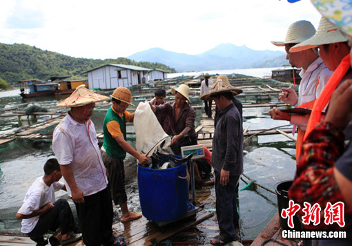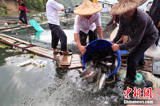 自7月8日起,福建永定縣棉花灘庫(kù)區(qū)因受上杭紫金山銅礦濕法場(chǎng)廢水外滲出現(xiàn)大量死魚(yú)現(xiàn)象后,永定縣政府采取措施,派出工作組分赴各網(wǎng)箱養(yǎng)殖場(chǎng)統(tǒng)一收購(gòu)受污染的魚(yú)。對(duì)于死魚(yú)和難以存活的魚(yú),進(jìn)行無(wú)害化集中填埋,并制訂“網(wǎng)箱上岸、破網(wǎng)入庫(kù)”等有效措施,對(duì)網(wǎng)箱里存活的魚(yú),同樣按綜合價(jià)每斤6元進(jìn)行統(tǒng)一收購(gòu),并及時(shí)放入大庫(kù)。盧基瑩 賴初源/攝