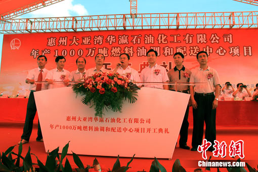 總投資53.9億元人民幣,設(shè)計年生產(chǎn)能力達1000萬噸的廣東惠州大亞灣華瀛石油化工有限公司燃料油調(diào)和配送中心項目9日正式動工建設(shè)。該項目是廣東省重點項目,建成投產(chǎn)后或?qū)⒊蔀橹袊畲笕剂嫌驼{(diào)和配送中心。 圖為惠州市委書記黃業(yè)斌宣布惠州大亞灣華瀛石油化工有限公司燃料油調(diào)和配送中心項目開工?敌⒕ 攝