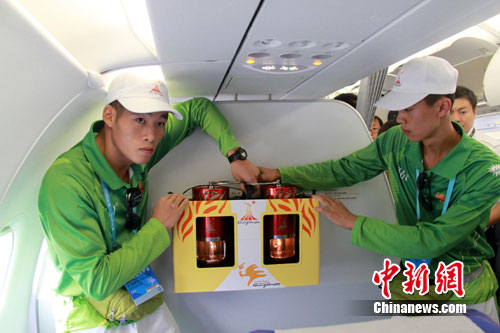 14日下午,南航亞運(yùn)火炬?zhèn)鬟f航班CZ3799從廣州飛抵青島。航班承載亞運(yùn)火炬中心火種護(hù)衛(wèi)人員10人,攜帶2盞圣火火種燈,圣火火種將被用于10月15日下午在山東海陽的火炬?zhèn)鬟f。圖為圣火火種護(hù)衛(wèi)人員把火種固定在飛機(jī)客艙。中新網(wǎng)發(fā) 王維鳳 攝