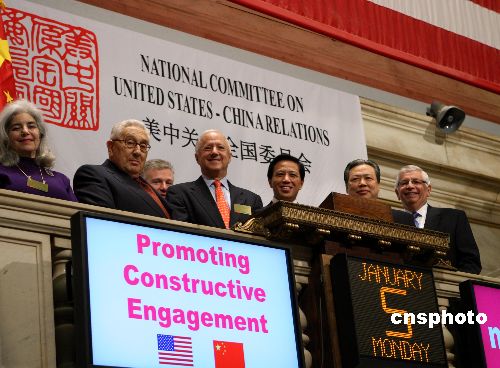 美國(guó)紐約證券交易所5日舉行紀(jì)念儀式慶祝中美建交30周年,美中關(guān)系全國(guó)委員會(huì)會(huì)長(zhǎng)歐倫斯(左四)敲響開市鐘,中國(guó)常駐聯(lián)合國(guó)代表張業(yè)遂(右三)、中國(guó)駐紐約總領(lǐng)事館總領(lǐng)事彭克玉(右二)、美國(guó)前國(guó)務(wù)卿基辛格(左二)、美國(guó)NBA總裁斯特恩(右一)、紐交所執(zhí)行總裁尼德奧爾(左三)、美中關(guān)系全國(guó)委員會(huì)副會(huì)長(zhǎng)白莉娟(左一)等出席儀式。中新社發(fā) 李靜 攝