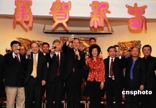 當(dāng)?shù)貢r(shí)間1月16日晚,中國駐美大使周文重(前排中)和夫人謝淑敏女士(前右四)在華盛頓中國城,向來自海峽兩岸的大華府十八個(gè)最大僑社領(lǐng)袖以及大華府地區(qū)及廣大旅美僑胞祝賀牛年新春。圖為周大使夫婦和僑社領(lǐng)袖們向廣大僑胞敬酒賀新春。中新社發(fā) 邱江波 攝