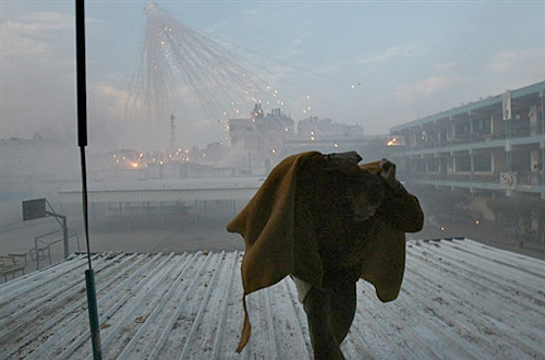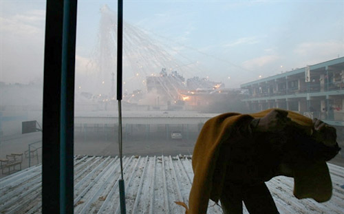 以軍1月17日再次襲擊加沙北部一所聯(lián)合國學校,一名婦女和一名兒童喪生,以軍坦克和巴勒斯坦武裝分子在學校附近激烈交火。圖為一名巴勒斯坦人在戰(zhàn)火中逃生。