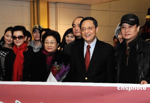 國務院僑辦主任李海峰率領的“文化中國·四海同春”藝術團今天(2月3日)下午抵達華盛頓,著名歌唱家宋祖英、閻維文等藝術家同機抵達,受到當?shù)厝A僑華人的熱烈歡迎。圖為中國駐美大使周文重率中國駐美大使館官員到機場迎接李海峰及明星們。中新社發(fā) 邱江波 攝