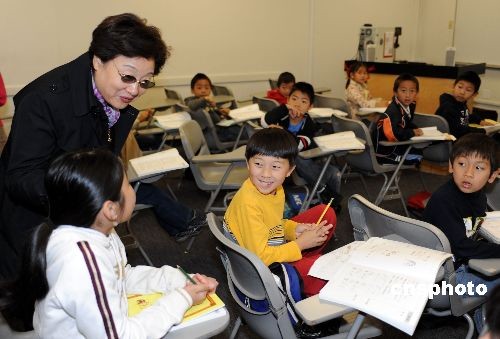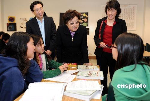 當(dāng)?shù)貢r(shí)間二月八日,中國國務(wù)院僑辦主任李海峰(中)來到美國加州圣地亞哥華夏中文學(xué)校參觀訪問,并與學(xué)生進(jìn)行面對面交流,了解他們的家庭語言環(huán)境和中文學(xué)習(xí)進(jìn)展。據(jù)了解,從今年開始,國僑辦將在海外遴選一批“華文教育示范學(xué)校”,并在教材、師資等方面提供幫助與扶持。中新社發(fā) 張煒 攝
