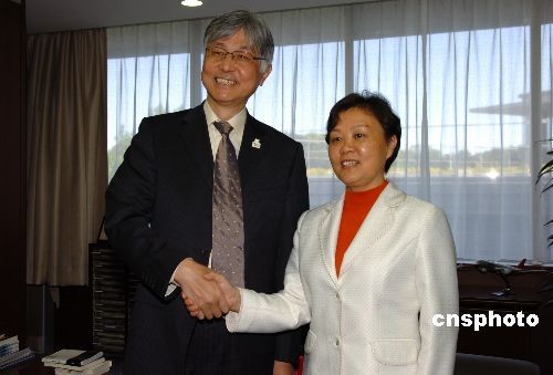 4月27日上午,以中國(guó)國(guó)家旅游局副局長(zhǎng)杜一力為團(tuán)長(zhǎng)的中國(guó)國(guó)家旅游局代表團(tuán),訪問(wèn)位于東京的日本國(guó)土交通省,并與日本觀光廳長(zhǎng)官本保芳明舉行會(huì)談。雙方就進(jìn)一步推動(dòng)中日觀光旅游業(yè)的發(fā)展與合作達(dá)成共識(shí)。圖為杜一力(右)與本保芳明握手。中新社發(fā) 朱沿華 攝