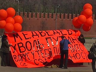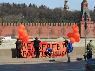 據(jù)俄羅斯新聞網(wǎng)報道,俄羅斯反對黨“團結(jié)運動”組織成員4月28日在克里姆林宮前舉行了聲勢浩大的反政府游行活動。期間,3名“團結(jié)運動”的積極分子在克里姆林宮附近的河岸邊懸掛紅色的巨型橫幅,上面印有:“梅德維杰夫,辭去普京總理職務(wù)!弊謽,橫幅兩邊系有紅色的氣球,橫幅下部印有“團結(jié)運動”組織的徽標。