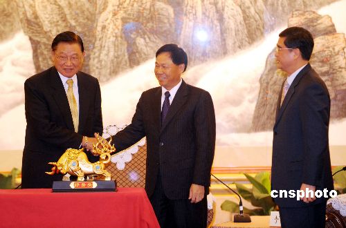 一月七日,深圳市委常委李意珍(中)會(huì)見(jiàn)并宴請(qǐng)臺(tái)灣海峽交流基金會(huì)董事長(zhǎng)江丙坤一行。中新社發(fā) 陳文 攝