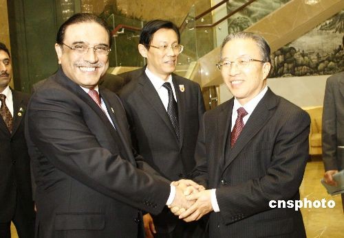 2月21日晚,中國國務(wù)委員戴秉國代表中國政府在武漢會(huì)見了到訪的巴基斯坦總統(tǒng)扎爾達(dá)里。應(yīng)中國政府邀請(qǐng),20日至23日,扎爾達(dá)里總統(tǒng)將先后訪問湖北和上海,考察中國水利、農(nóng)業(yè)、金融等領(lǐng)域發(fā)展情況。中新社發(fā) 艾啟平 攝
