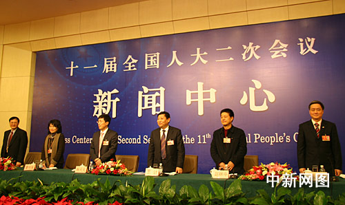 3月6日下午,出席十一屆全國人大二次會(huì)議的5位企業(yè)家代表在大會(huì)新聞中心(梅地亞中心多功能廳)就“企業(yè)如何應(yīng)對國際金融危機(jī)的挑戰(zhàn)”接受中外記者的采訪。這五位代表是(從左二起)廣東團(tuán)代表、廣東省珠海格力電器股份有限公司副董事長、總裁董明珠;黑龍江團(tuán)代表、黑龍江省哈爾濱泰富公司董事長兼總經(jīng)理?xiàng)钐旆;四川團(tuán)代表、中國東方電氣集團(tuán)公司董事長、黨組書記王計(jì);浙江團(tuán)代表、浙江富潤控股集團(tuán)有限公司黨委書記、董事局主席趙林中;陜西團(tuán)代表、中國電子信息產(chǎn)業(yè)集團(tuán)董事長、黨組書記熊群力。中新網(wǎng)記者 唐偉杰 攝