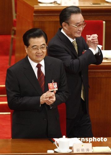 3月9日,十一屆全國(guó)人大二次會(huì)議在北京人民大會(huì)堂舉行第二次全體會(huì)議,圖為國(guó)家主席胡錦濤、全國(guó)人大常委會(huì)委員長(zhǎng)吳邦國(guó)在主席臺(tái)就座。中新社發(fā) 盛佳鵬 攝