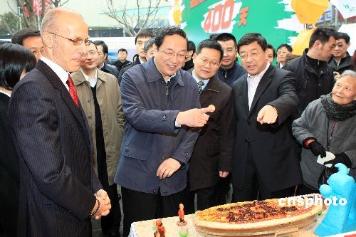 3月27日,2010年上海世博會倒計時400天,上海市舉行一系列發(fā)布與紀念活動。中共中央政治局委員、上海市委書記俞正聲參加迎世博會倒計時400天活動時,觀看服務(wù)行業(yè)技能展示。中新社發(fā) 湯彥俊 攝