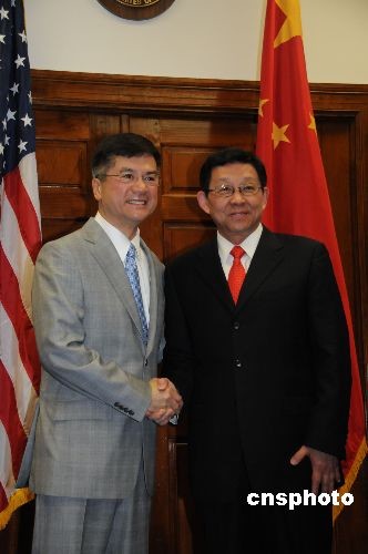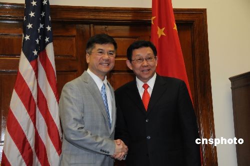 四月二十七日,中國(guó)商務(wù)部長(zhǎng)陳德銘在華盛頓會(huì)見(jiàn)了美國(guó)商務(wù)部長(zhǎng)駱家輝,雙方就進(jìn)一步發(fā)展中美經(jīng)貿(mào)關(guān)系深入交換了意見(jiàn),并一致強(qiáng)調(diào)共同抵制貿(mào)易保護(hù)主義。圖為陳德銘(右)與駱家輝在會(huì)晤前共同見(jiàn)記者。中新社發(fā) 吳慶才 攝