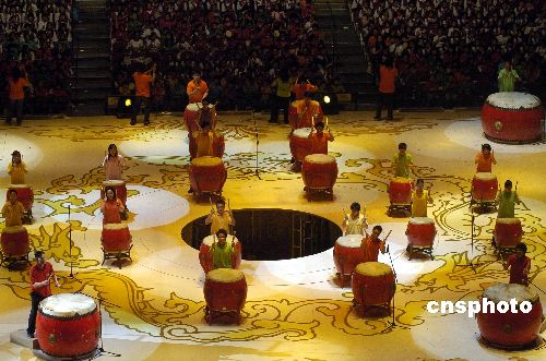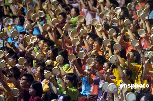 | 2007年6月29日,為慶祝香港回歸祖國10周年,萬名來自內(nèi)地、香港、澳門、臺灣的青年齊集香港體育館,以“鼓樂飛揚(yáng)”的創(chuàng)意、勵志激昂的樂曲為藍(lán)本、擊打萬面鼓的形式,創(chuàng)出新的吉尼斯世界紀(jì)錄。本次活動主題為《龍聲鼓舞--萬人青年音樂會》,由香港民政事務(wù)局、中華全國青年聯(lián)合會、香港青年協(xié)會及中央電視臺等有關(guān)機(jī)構(gòu)聯(lián)合舉辦。萬人鼓樂《龍的傳人》和《紅日》曲目由著名打擊樂家龍向榮博士編曲及領(lǐng)奏,以五種鼓樂合奏,包括鈴鼓、布郎鼓、雙棍單皮鼓、沙槌鼓和皮手鼓,在超過一萬名青年齊心合奏下完成。中新社發(fā) 吳峻 攝