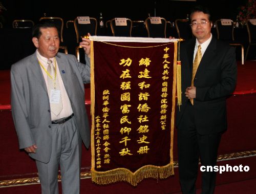 | 8月11日到12日,歐洲華僑華人社團聯(lián)合會成立十五周年慶祝大會在歐盟首都--比利時的布魯塞爾舉行。歐洲各國主要僑團的代表聚集一堂,共商旅居歐洲的華僑華人生存和發(fā)展的大計。圖為在大會閉幕式上,國務(wù)院僑辦副主任許又聲(右)代表僑辦接受歐華聯(lián)會第十四屆主席、法國僑領(lǐng)林德標贈送的錦旗。中新社發(fā) 鐘誠 攝