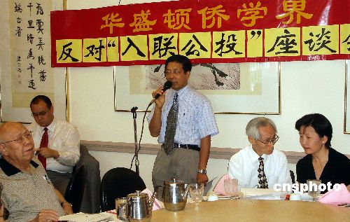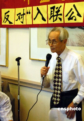 圖為華盛頓老僑領(lǐng)黃企之先生在集會(huì)上痛斥臺(tái)灣當(dāng)局“入聯(lián)公投”。