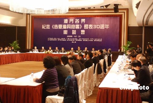 “澳門各界紀念《告臺灣同胞書》發(fā)表三十周年座談會” 十二月三十一日下午舉行,澳門特區(qū)行政長官何厚鏵、中央駐澳聯(lián)絡辦主任白志健等嘉賓及澳門各界代表一百余人出席。中新社發(fā) 畢永光 攝