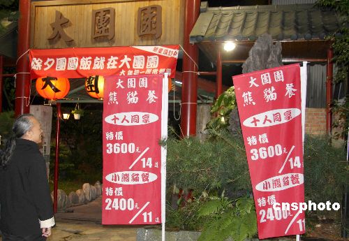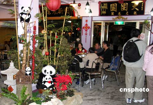 隨著大陸贈臺大熊貓團(tuán)團(tuán)、圓圓已經(jīng)來臺,臺灣臺北縣深坑鄉(xiāng)出現(xiàn)一家“大團(tuán)圓”飯店。元旦期間,該店別出心裁推出的“熊貓餐”吸引顧客。中新社發(fā) 陳立宇 攝