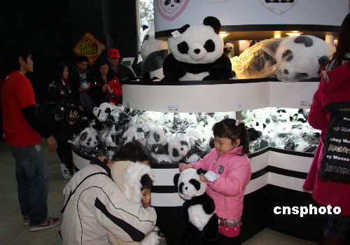 1月26日,大年初一。大陸贈(zèng)臺(tái)大熊貓團(tuán)團(tuán)圓圓正式與臺(tái)灣民眾見(jiàn)面,圖為團(tuán)團(tuán)圓圓居住的臺(tái)北市動(dòng)物園新光特展館熊貓商品展銷(xiāo)廳中,小朋友對(duì)絨毛熊貓玩偶愛(ài)不釋手。中新社發(fā) 陳立宇 攝