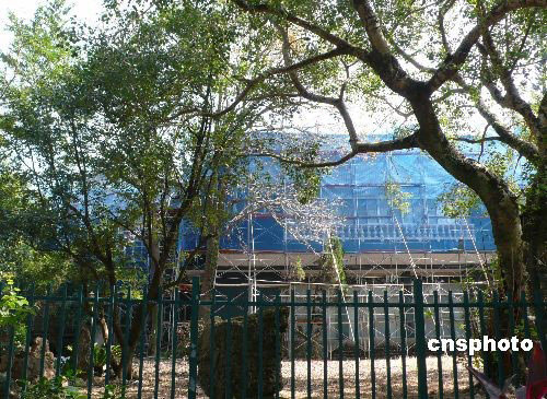 蔣介石和宋美齡的故居——士林官邸的正房目前正在全面修繕中,修繕工程約將耗時一年半,計劃于2009年11月17日竣工。士林官邸前身為日據(jù)時代的士林園藝試驗(yàn)分所,正房于1950年完成,為一棟兩層水泥建物,外墻為深綠色,有隱蔽作用,內(nèi)部則以住家格局設(shè)計,木造地板,鋪瓦屋頂。圖為正房的前門入口,已經(jīng)被藍(lán)色的紗布圍住。修繕工程竣工后,正房最快將于今年年底開放供民眾參觀。中新社發(fā) 路梅 攝