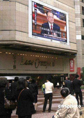 三月五日上午,香港市民在時代廣場通過大屏幕收看國務院總理溫家寶在十一屆全國人大二次會議上作的《政府工作報告》。中新社發(fā) 張勤 攝