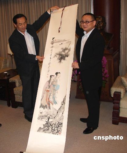 三月二十五日,由十七家大陸中央媒體負(fù)責(zé)人組成的訪問團拜訪臺灣《聯(lián)合報》。圖為訪問團團長、《人民日報》總編輯吳恒權(quán)(左)向《聯(lián)合報》贈送禮品。中新社發(fā) 耿軍 攝