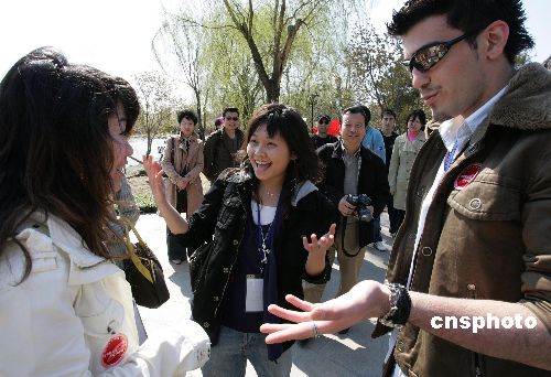 | 4月8日,北京植物園正是柳綠花紅、梅花盛開(kāi)、玉蘭飄香時(shí)節(jié),“激情迎奧運(yùn)外語(yǔ)伴你行”系列外語(yǔ)培訓(xùn)活動(dòng)在北京植物園啟動(dòng),該活動(dòng)是“全民健身迎奧運(yùn)” 系列活動(dòng)的一部分,專(zhuān)業(yè)外籍教師和熱心聽(tīng)眾、植物園的服務(wù)人員一起參與,教學(xué)方式設(shè)計(jì)了“記憶背誦”、“信任背摔”以及“模擬場(chǎng)景”的互動(dòng)游戲,為2008年服務(wù)于北京奧運(yùn)會(huì)的志愿者提供學(xué)習(xí)英語(yǔ)的機(jī)會(huì)。圖為外語(yǔ)學(xué)院的學(xué)生與聽(tīng)眾一起交流學(xué)習(xí)。中新社發(fā) 錢(qián)興強(qiáng) 攝