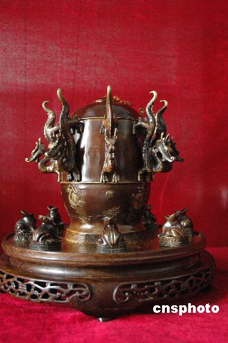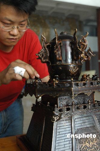 | 6月17日,吳迪在現場演示仿古精銅張衡候風地動儀。河南南陽市民吳勇才、吳迪父子歷時6年,克服道道難關利用“精準導擺原理”,終于研制出仿古精銅張衡候風地動儀。正如《后漢書》中描述:“以精銅鑄成……形似酒尊……外有八龍,首銜銅丸,下有蟾蜍,張口承之……”據悉,吳勇才、吳迪父子研制出的仿古精銅張衡候風地動儀主要由4部分組成,一是制衡部分,也就是都柱;二是制導系統(tǒng),包括八道和杠桿總承;三是機架等輔助系統(tǒng);四是外觀即外殼、尊體上的八條龍,銅珠丸、蟾蜍、基座等。而其主要部分是內部機芯即都柱和制導系統(tǒng)。國家地震局地球物理勘探中心專家在評審中,對吳勇才、吳迪父子研制的地動儀進行了現場震動測試,專家們給予了很高的評價。中新社發(fā) 楊銀鵬 攝