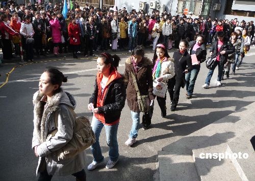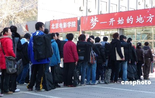 2009年2月7日,北京電影學(xué)院2009年招生初試工作已進入了第三天,一批批來自全國各地的考生繼續(xù)為圓明星夢而拼搏努力。今年最顯著的特點是本色考生越來越多,濃妝艷抹、奇裝異服的考生少了。據(jù)悉,表演專業(yè)一直被認(rèn)為是北影“最難考的專業(yè)”,雖然今年的招生人數(shù)由往年的30人增加到75人,但面對4234名報考者,淘汰率仍高達98.2%。一位考官告訴記者,雖然報名者很多,但有充分準(zhǔn)備、專業(yè)水平較高的考生不超過千人,還是有很多考生很盲目。中新社發(fā) 玉龍 攝