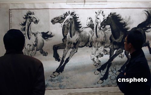 3月10日,“中國(guó)現(xiàn)代美術(shù)奠基人系列展·徐悲鴻大型藝術(shù)展”在北京炎黃藝術(shù)館舉行,一幅著名的國(guó)畫(huà)作品《群奔》吸引參觀者目光。本次展覽由北京市文化局、徐悲鴻紀(jì)念館和炎黃藝術(shù)館聯(lián)合主辦,共展出80多件徐悲鴻真跡,涵蓋了徐先生各個(gè)時(shí)期的代表作,其中包括他早期的素描《馬與馬夫》、《女人體》、《自畫(huà)像》等。中新社發(fā) 鄭雄增 攝