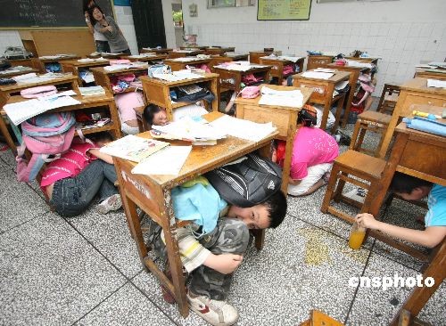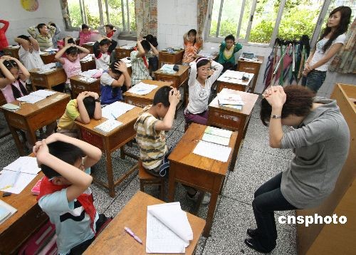 5月12日,重慶江北華新實(shí)驗小學(xué)的孩子們在學(xué)習(xí)災(zāi)害發(fā)生時的緊急避難知識。當(dāng)日是首個“防災(zāi)減災(zāi)日”,重慶各學(xué)校紛紛進(jìn)行防災(zāi)避難課和災(zāi)害發(fā)生時的緊急避難及人員疏散演練,提高孩子們在災(zāi)害發(fā)生時的自我保護(hù)意識和掌握各種臨時避難方法。中新社發(fā) 賀終榮 攝