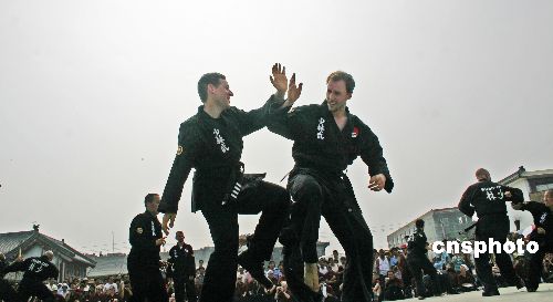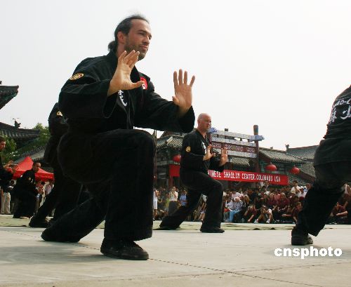 | 6月29日,在山東省陽谷縣獅子樓前,來自美國的武術(shù)愛好者進(jìn)行太極拳表演。當(dāng)日,美國科羅拉多州少林武術(shù)中心的近100名武術(shù)愛好者來到素有“武術(shù)之鄉(xiāng)”美稱的山東省陽谷縣進(jìn)行武術(shù)交流。他們與這里的民間武術(shù)愛好者在獅子樓景區(qū)前進(jìn)行武術(shù)交流表演。雙方表演了太極拳、八卦掌、中華棍術(shù)、刀術(shù)等精彩項(xiàng)目。近年來,隨著中國文化的廣泛傳播,在許多國家都掀起了中國功夫熱,各國的武術(shù)民間團(tuán)體或個(gè)人紛紛前來學(xué)習(xí)中國武術(shù)。中新社發(fā) 肖明磊 攝